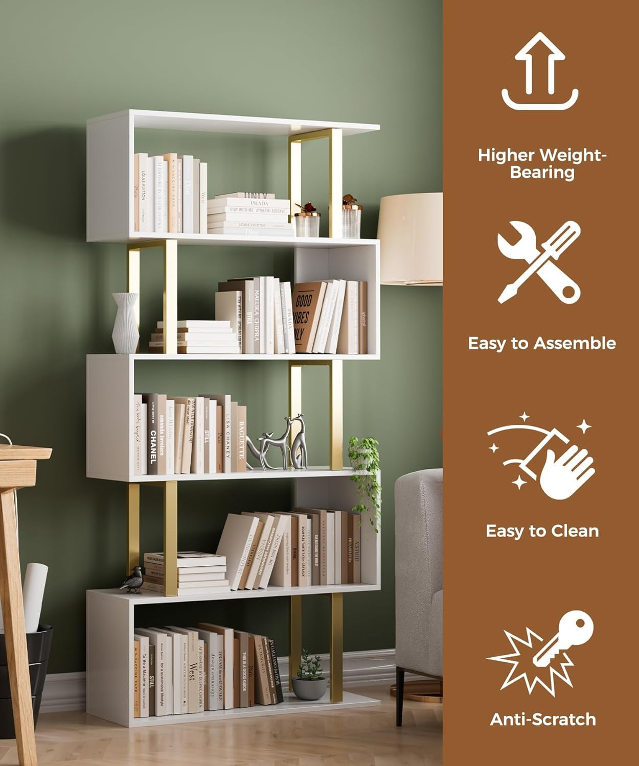 - 【5/6-tier S-shaped Bookcase】Perfect for organizing books, magazines, plants and other items in a neat and stylish manner