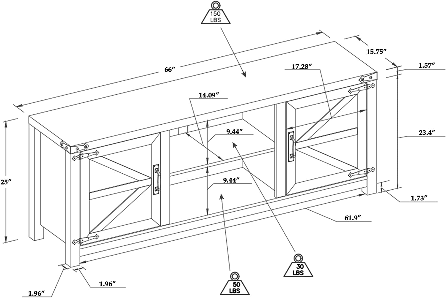 - Product Dimension: 66" L × 15.75" W × 25" H, Anchor your living room layout with modern farmhouse flair, this clean-lined piece accommodates a flat-screen up to 75 inches wide easily, featuring double barn door cabinets and an open cubby that provide plenty of storage capacity space for electronics and decor