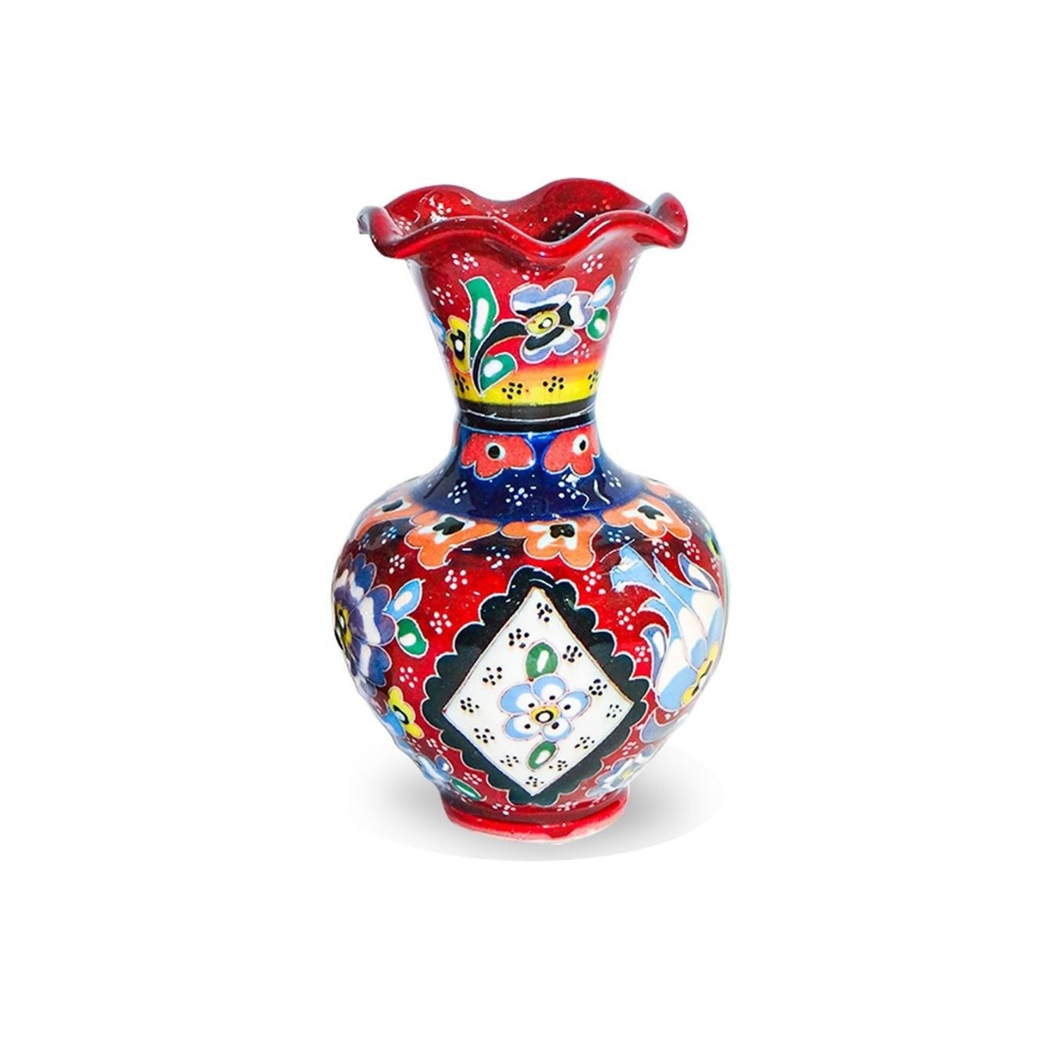 Bascuda Handmade Ceramic Vase, Iznik Series, Red Floral in Glossy red base adorned with colourful Iznik floral motifs and scalloped fluted rim. 23cm Height.