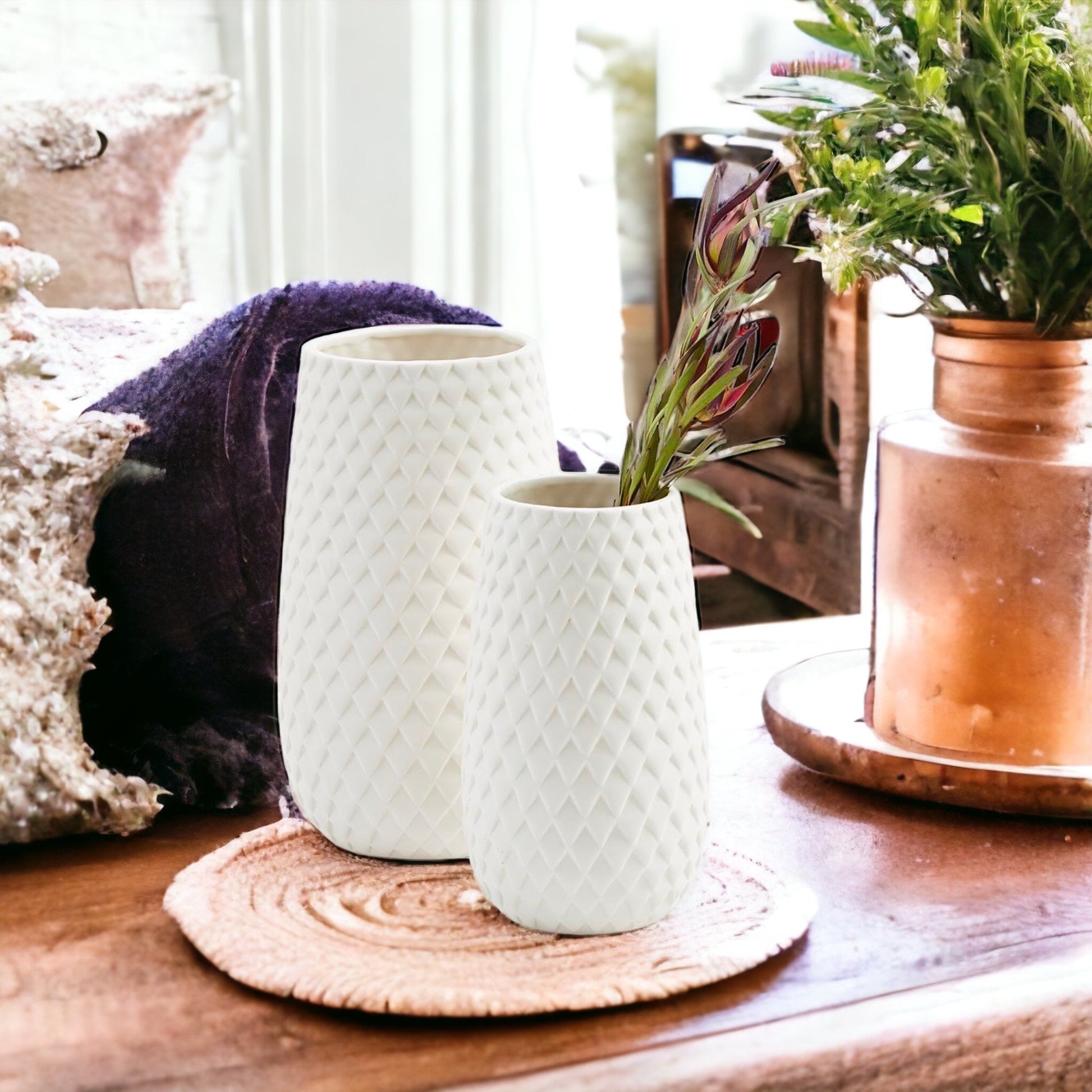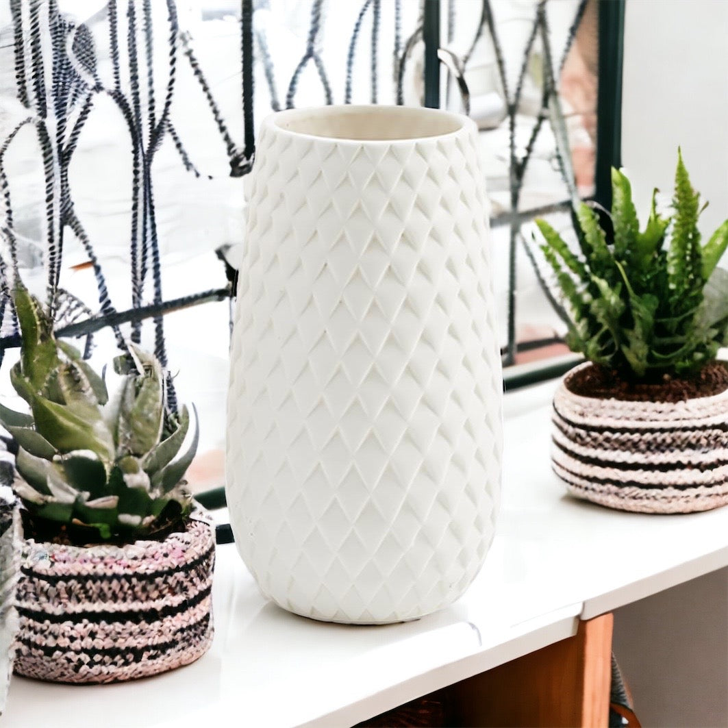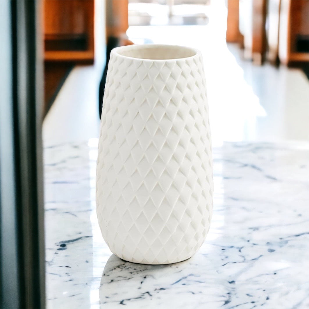 Make a statement with this ceramic Diamond Weave White Vase. Boasting a unique diamond weave pattern and constructed of high-quality dolomite, this vase adds a sophistication and class to any room. It's the perfect canvas for your creative vision — display alone or add some floral arrangements for your own custom look. Take a risk — elevate your space with this Diamond Vase!