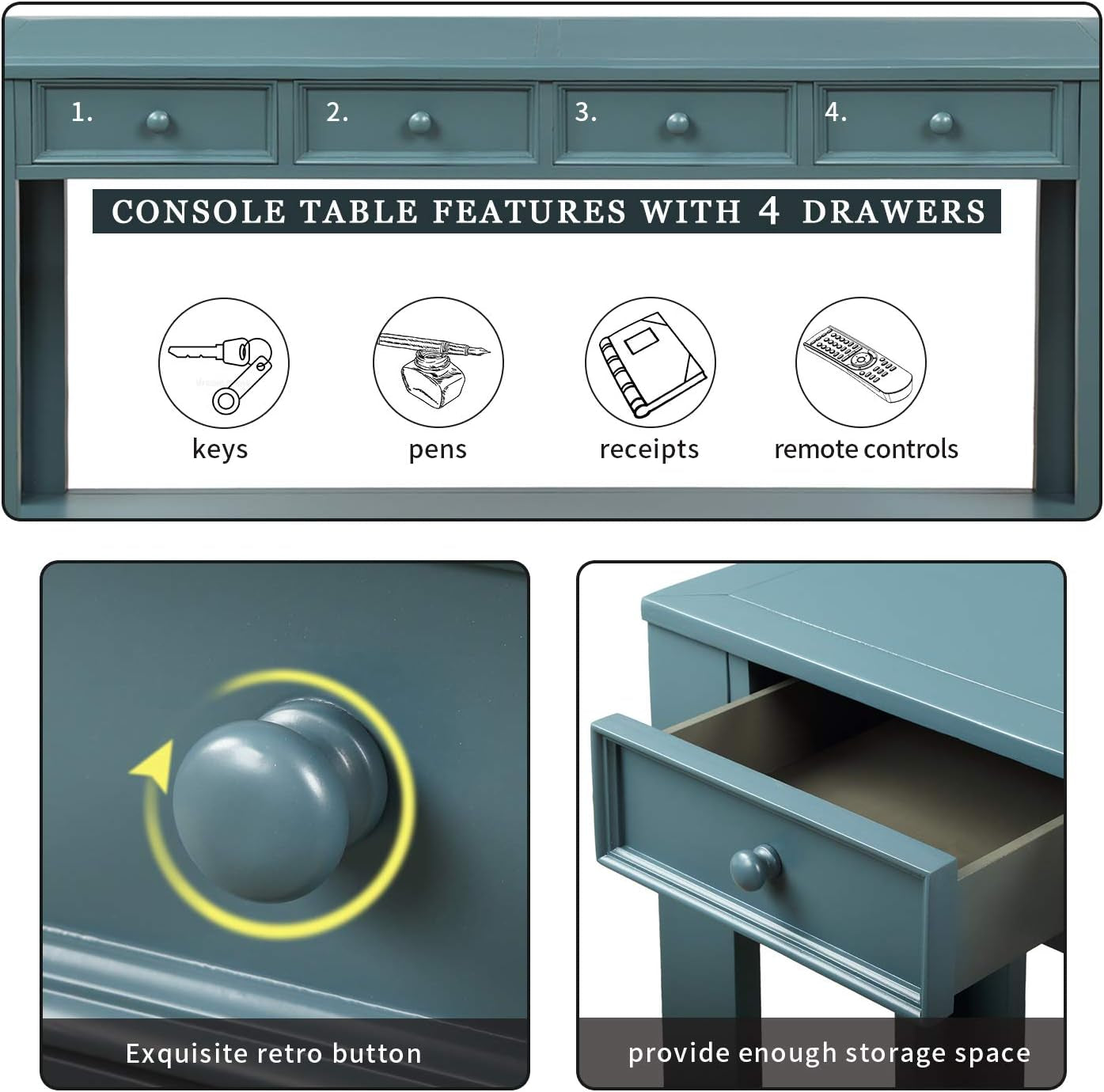 RUSTIC CHIC SOFA TABLEClassic accent table fits perfectly in any living room. What a stylish piece of console table set to elevate your living room or foyer entryway space! | SOLID WELL-CRAFTED TABLESolid wood frame and legs, more durable and sturdy use for years. | LARGE STORAGE SPACEThe console table features with 4 drawers and a fixed lower shelf and long enough tabletop which provide enough storage space. | FASHIONABLE LOOKRectangular console table with clean lines, elegantly straight table legs exude a high-end, elegant feel. |