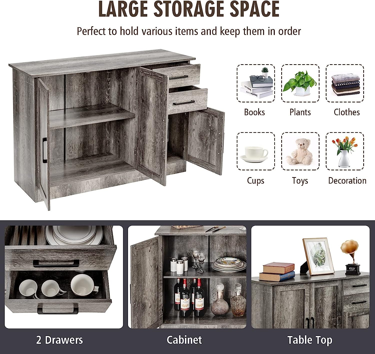 - 【Multipurpose Cabinet】: Do you need buffet server, cupboard, console cabinet? Owning this cabinet, you will have all. This organizer can fit well and hides so much while providing extra countertop space in kitchen, dining room or buffet party to store microwave, coffer maker, tea towels, food storage containers and extra kitchen gadgets.