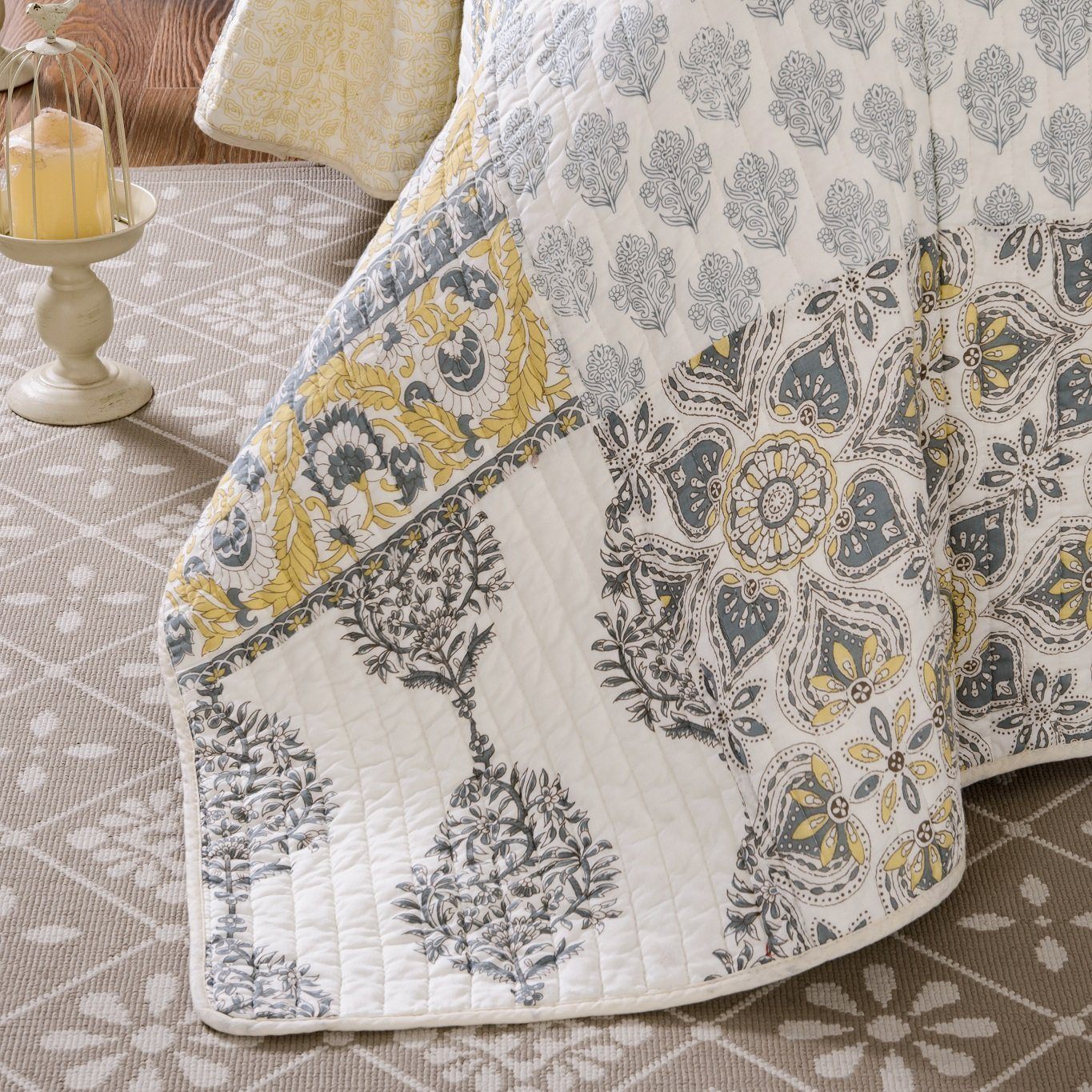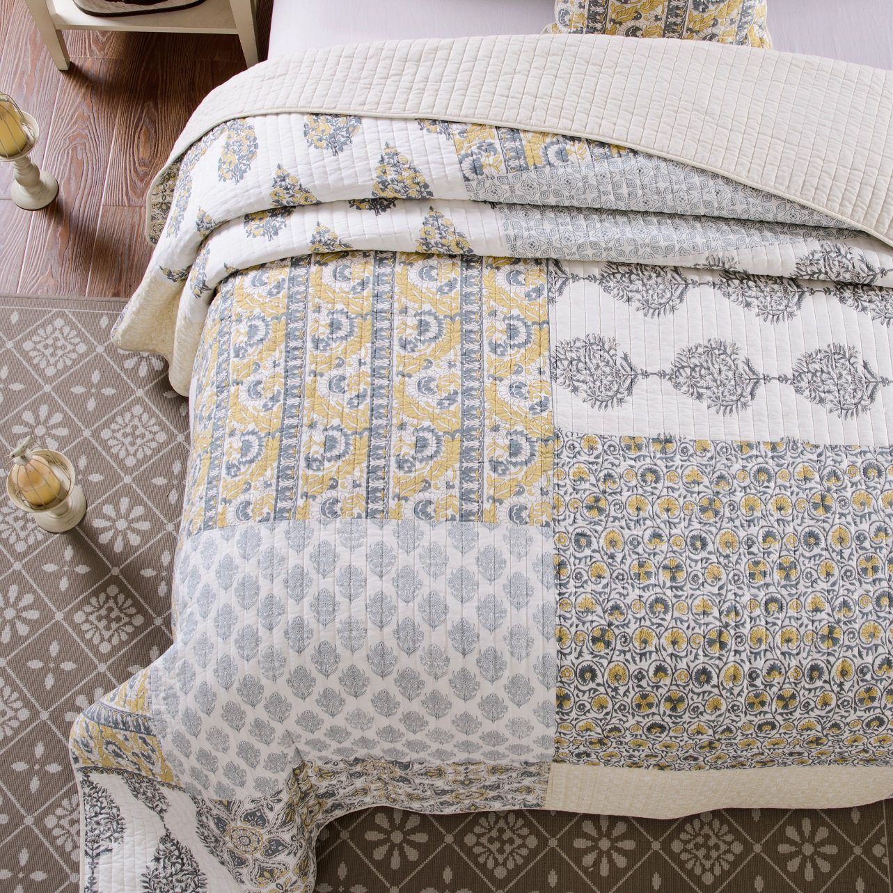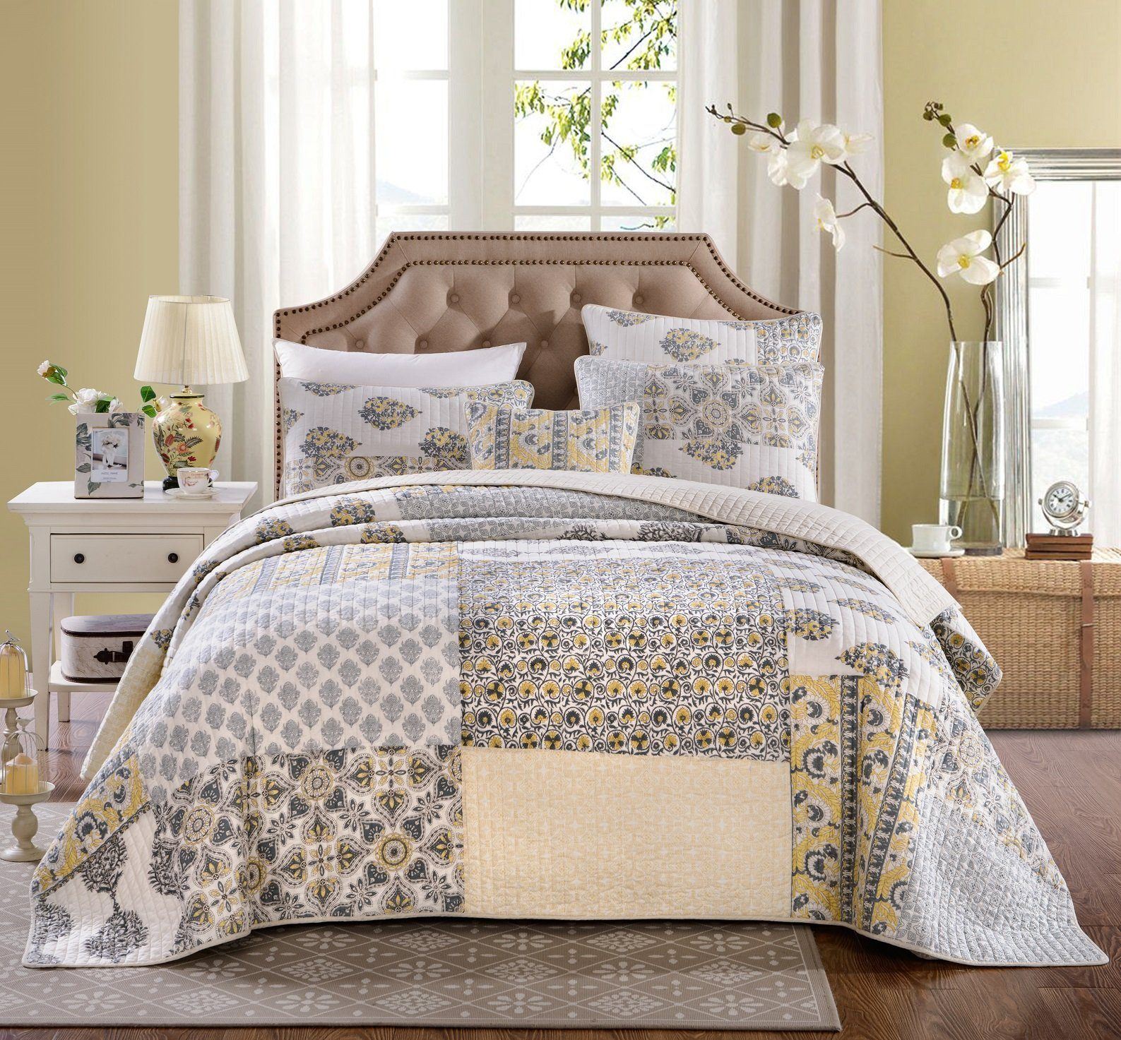 Enjoy our elegantly designed patchwork bedspread for a brightened look in any room. Accented with real patchwork damask floral patches stitched together all over the bedspread in yellow, grey and white shades.