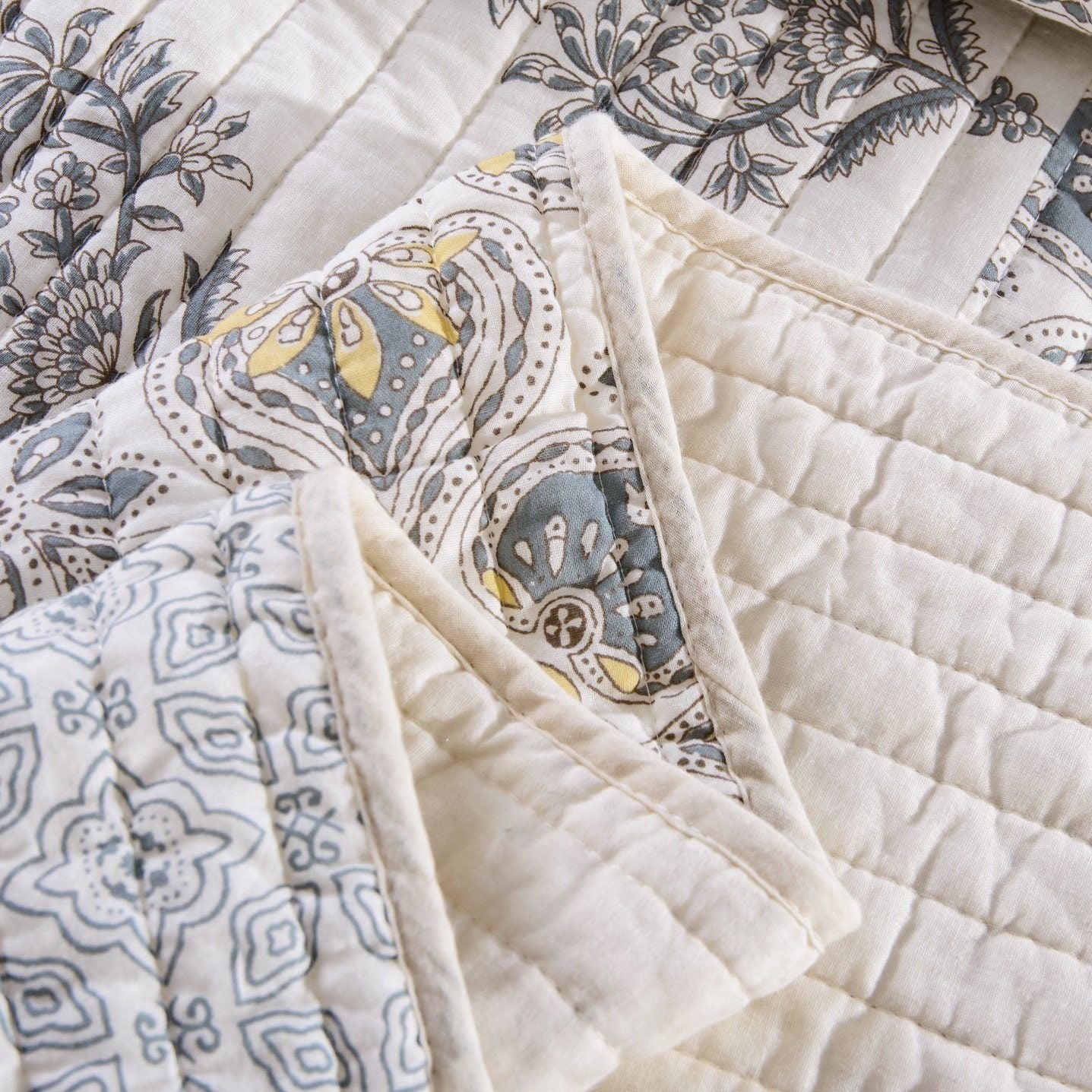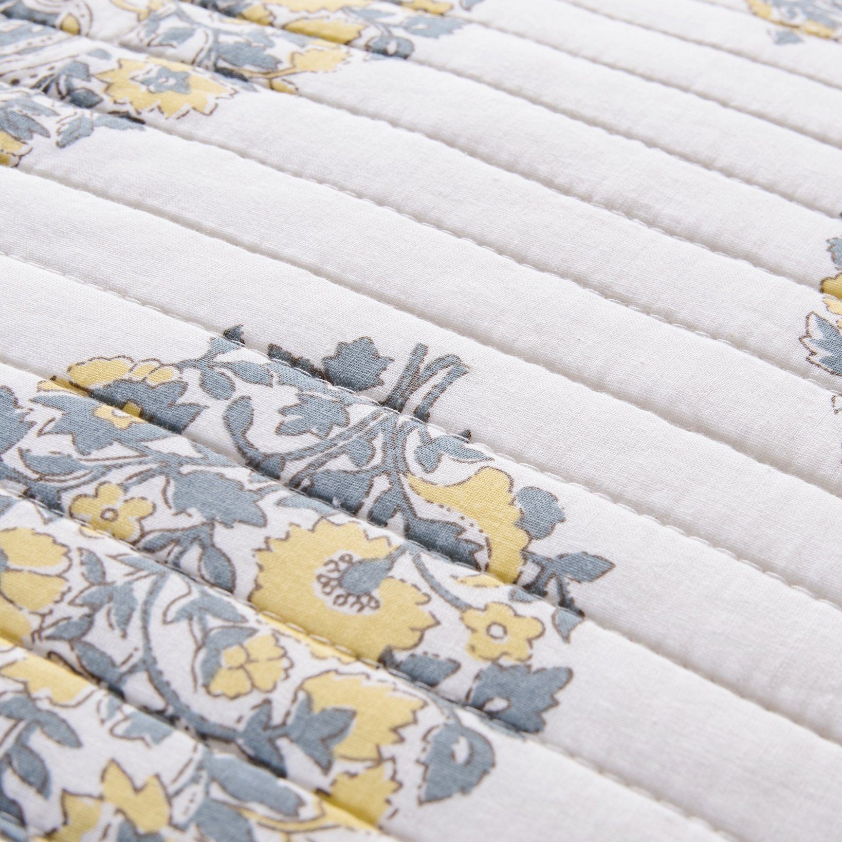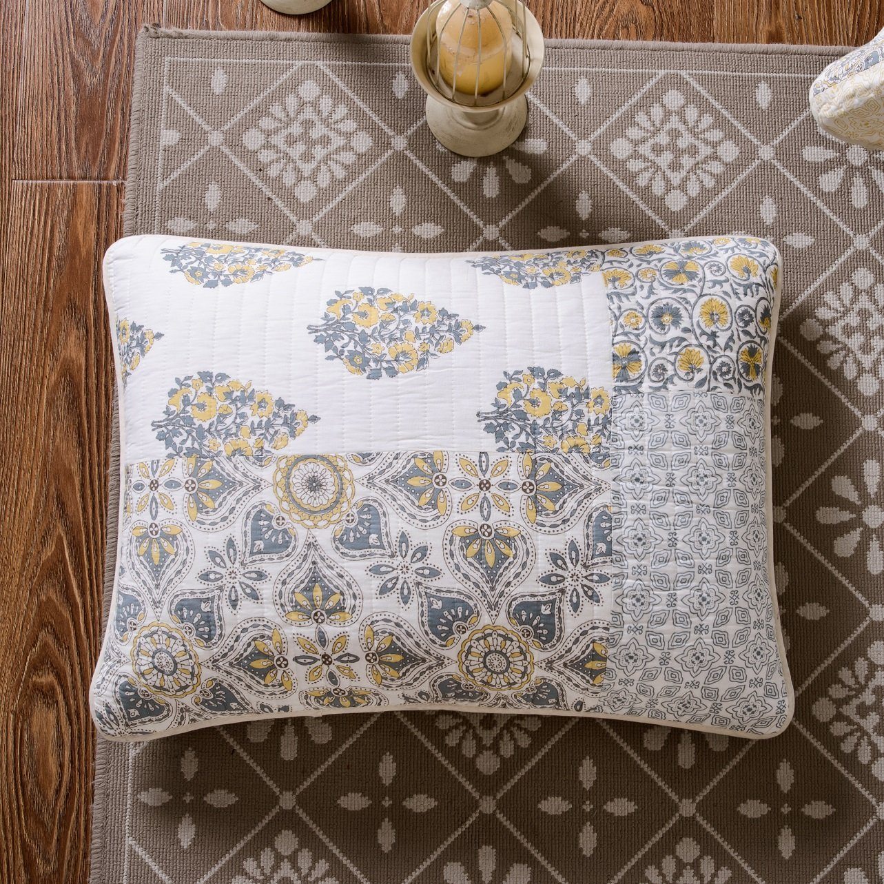 Enjoy our elegantly designed patchwork bedspread for a brightened look in any room. Accented with real patchwork damask floral patches stitched together all over the bedspread in yellow, grey and white shades.