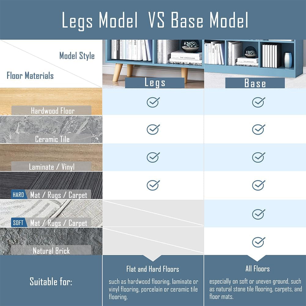 This open shelving bookcase has two mount models: the legs model and the base model, suitable for different flooring.