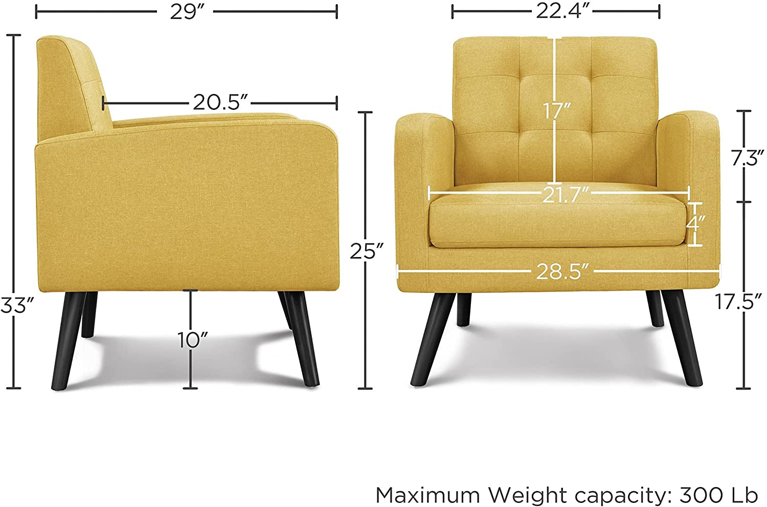 This accent chair’s seat and back cushions are made from a highly soft foam, allowing you to rest and read throughout the day without sinking. | The armrests and frame are made of durable wood, with no smell, no color difference, and the accent chair for the living room is so sturdy that it can hold 136 kg / 300 lb (static load capacity). | The legs of this fabric armchair are made from durable rubberwood. And the chair is raised by four tapered solid wood legs for easy cleaning. |